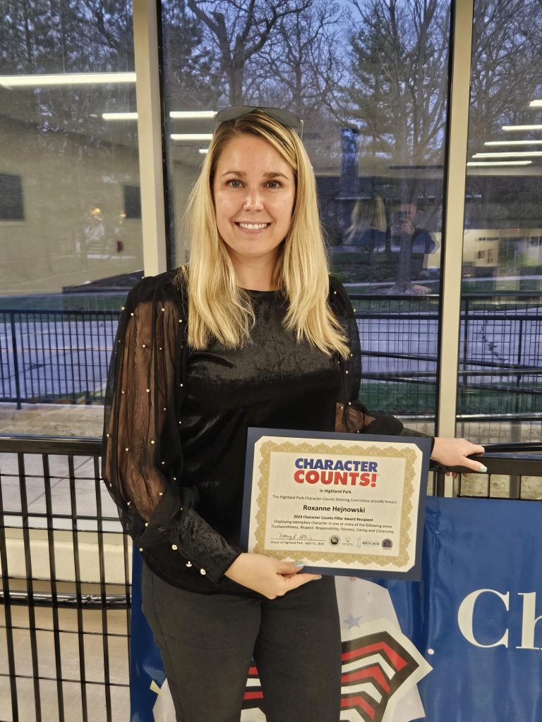 Park District of Highland Park Executive Coordinator Roxanne Hejnowski was recognized with a Character Counts Pillar Award at the 2024 City of Highland Park Awards ceremony held on Thursday, April 11.