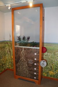 We have completely refurbished the existing Prairie Panel display, where you see just how deep prairie roots are in the ground, and how important they are to the ecosystem. These roots are good at reaching water more than a meter deep, and can live for a very long time. The new exhibit includes a crank wheel, so you can “pull up” a prairie root, study the image, and see how deep they actually go. When you’re all done, crank the wheel again and reset the display for the next budding ecologist.