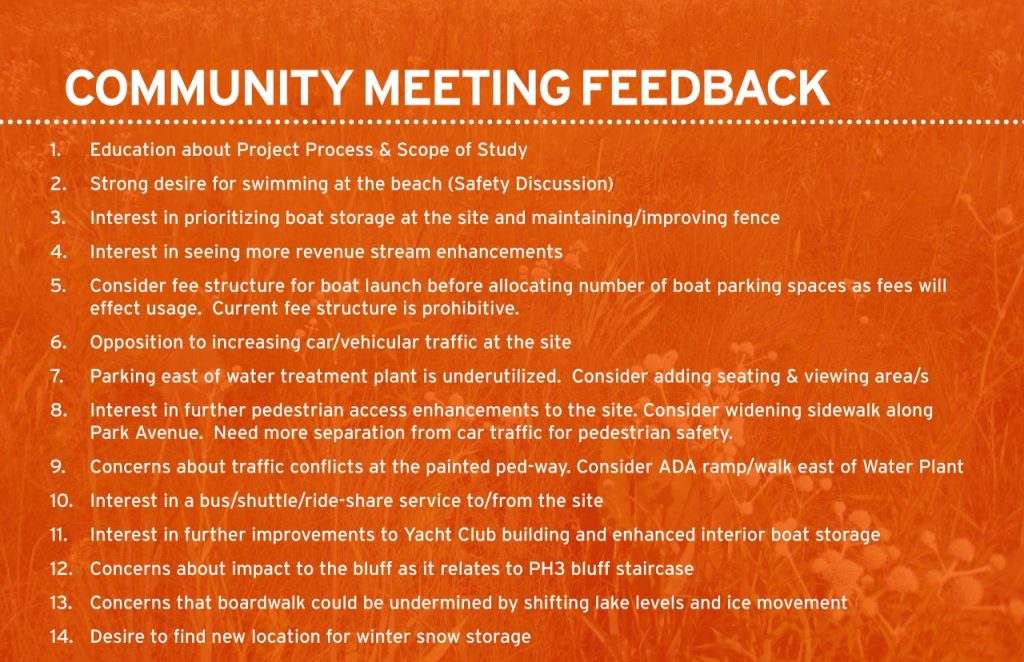 This community meeting was held to review the proposed concept site plan for the Park Avenue Beach and Boating Facility. The meeting included a brief introduction of the concept plan followed by an opportunity to take a closer look, ask questions, and provide feedback to the project team.