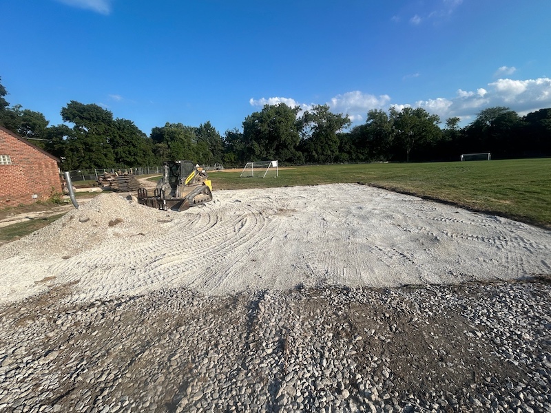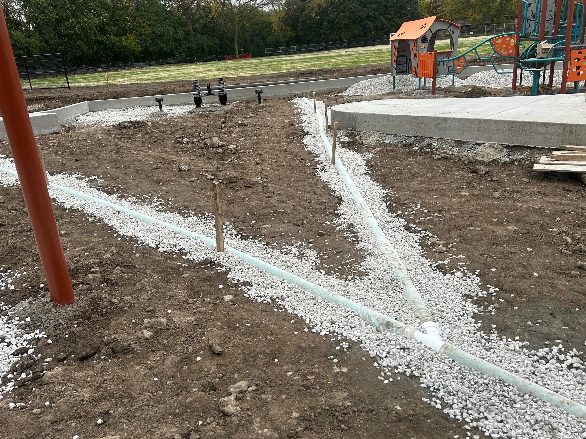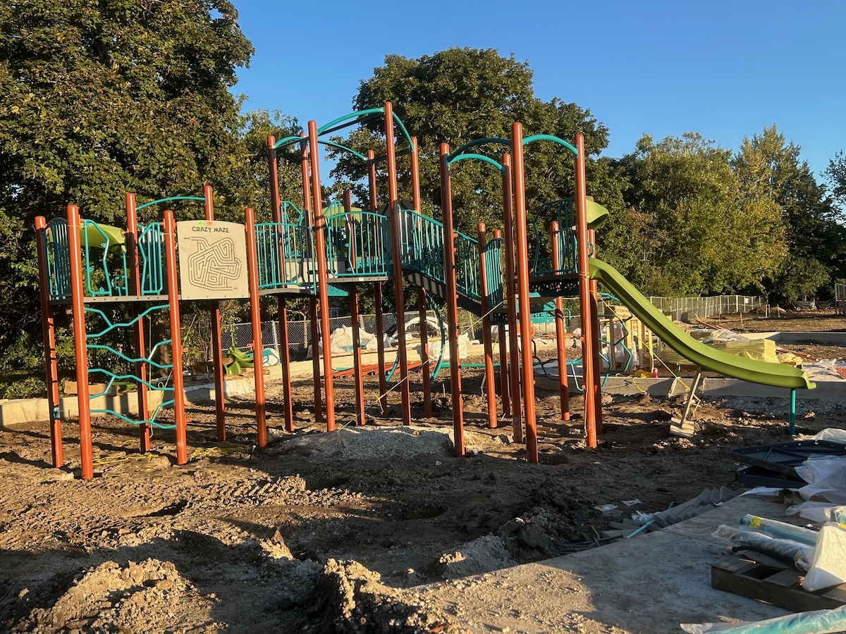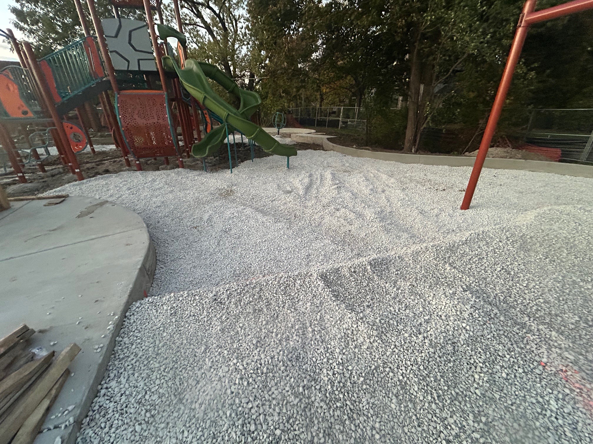 All of the playground equipment has been installed, and crews compacted the base layer for the playground surfacing.