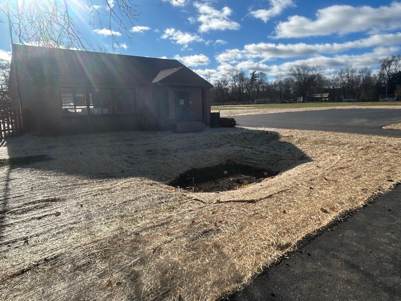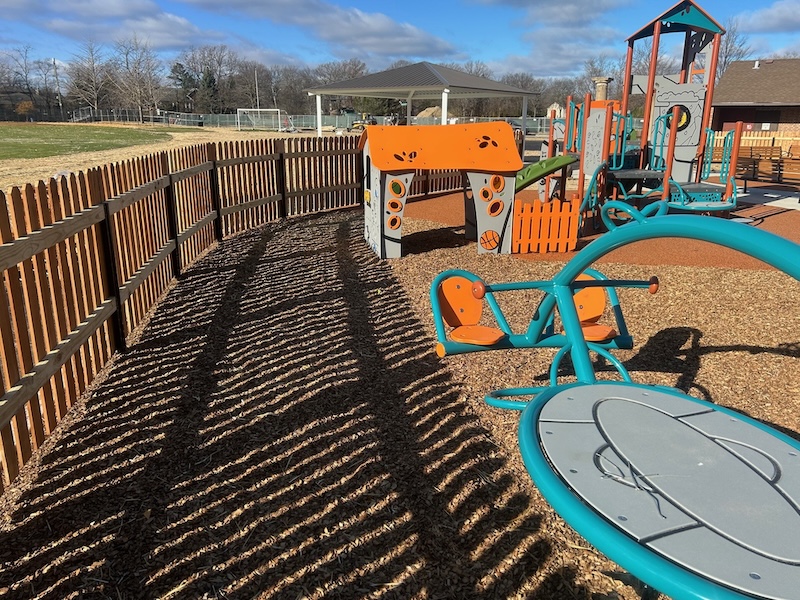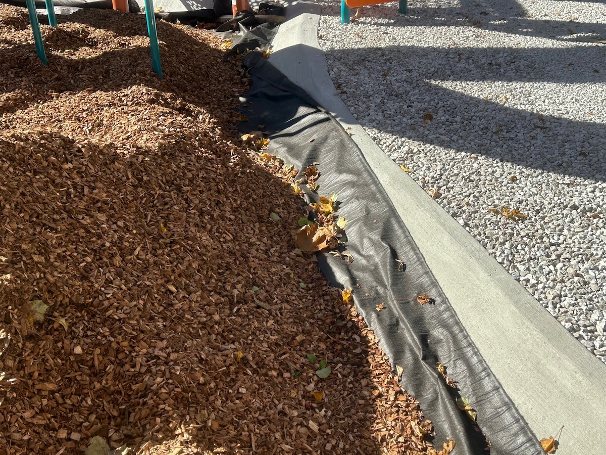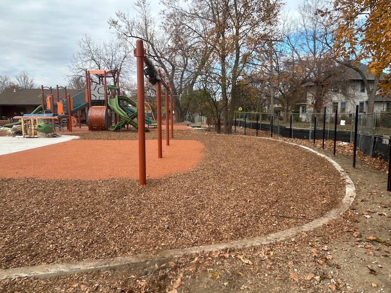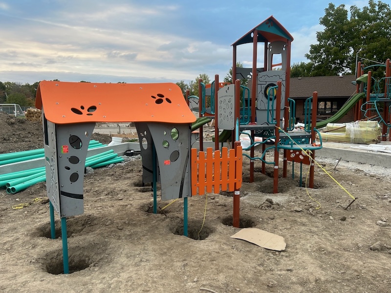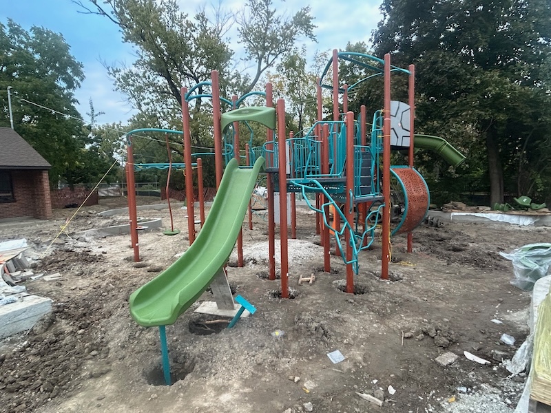 Playground: The woodchip playground surfacing has been installed and the base for the poured-in-place has been spread out. Up next, crews will install the poured-in-place surfacing.