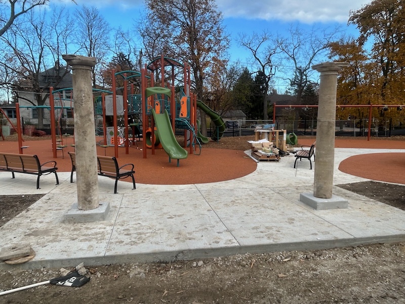 The Lincoln School columns have been installed at the entry of the playground. Up next is the installation of the benches and other site amenities.