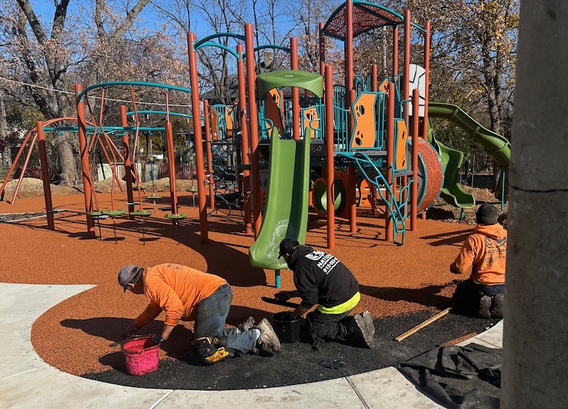 Installation of the playground surfacing has been completed. Up next is the installation of the playground fence.