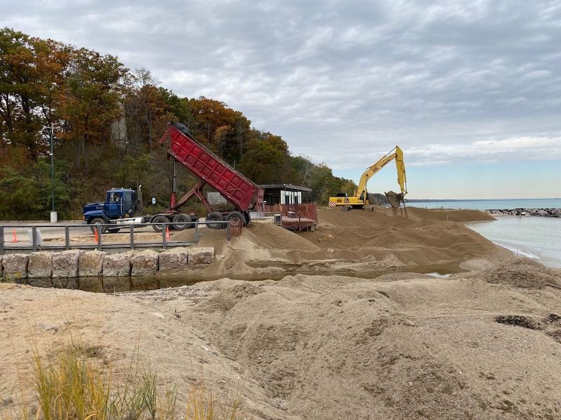 Crews completed the deliver and placement of sand at both the Nature and Swimming Coves. This week, the project team will begin removing the construction equipment the beach. The lake will continue flattening the newly placed material and creating a more stable slope.