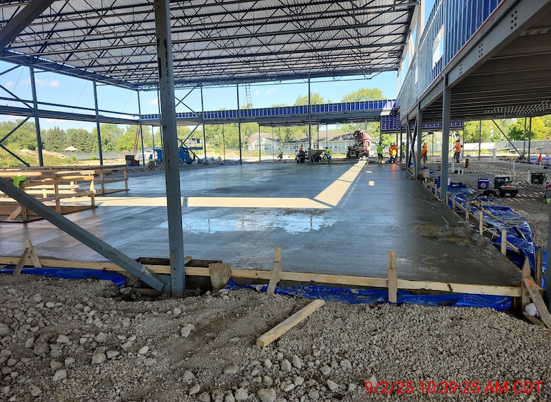 The building floor has been poured, and both the west and east sections of the roadway are complete. The remaining middle section is scheduled to be poured next week.