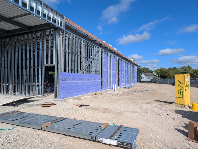 Inside the building, crews continue roughing in mechanical, electrical, and plumbing systems, while making steady progress on the exterior wall assembly and interior wall framing.