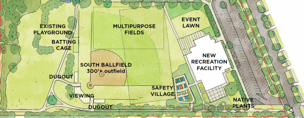 In Spring 2025, construction started on the new Recreation Facility at West Ridge Park. The New Recreation Facility is located southeast end on West Ridge Park and will be home to a multi-use recreation facility featuring a gymnastics gym, a multi-purpose dance room, flexible classroom spaces, and a multi-purpose community room. The surrounding event lawn, enrichment courtyard, and relocated safety village offer opportunity for indoor/outdoor program experiences.