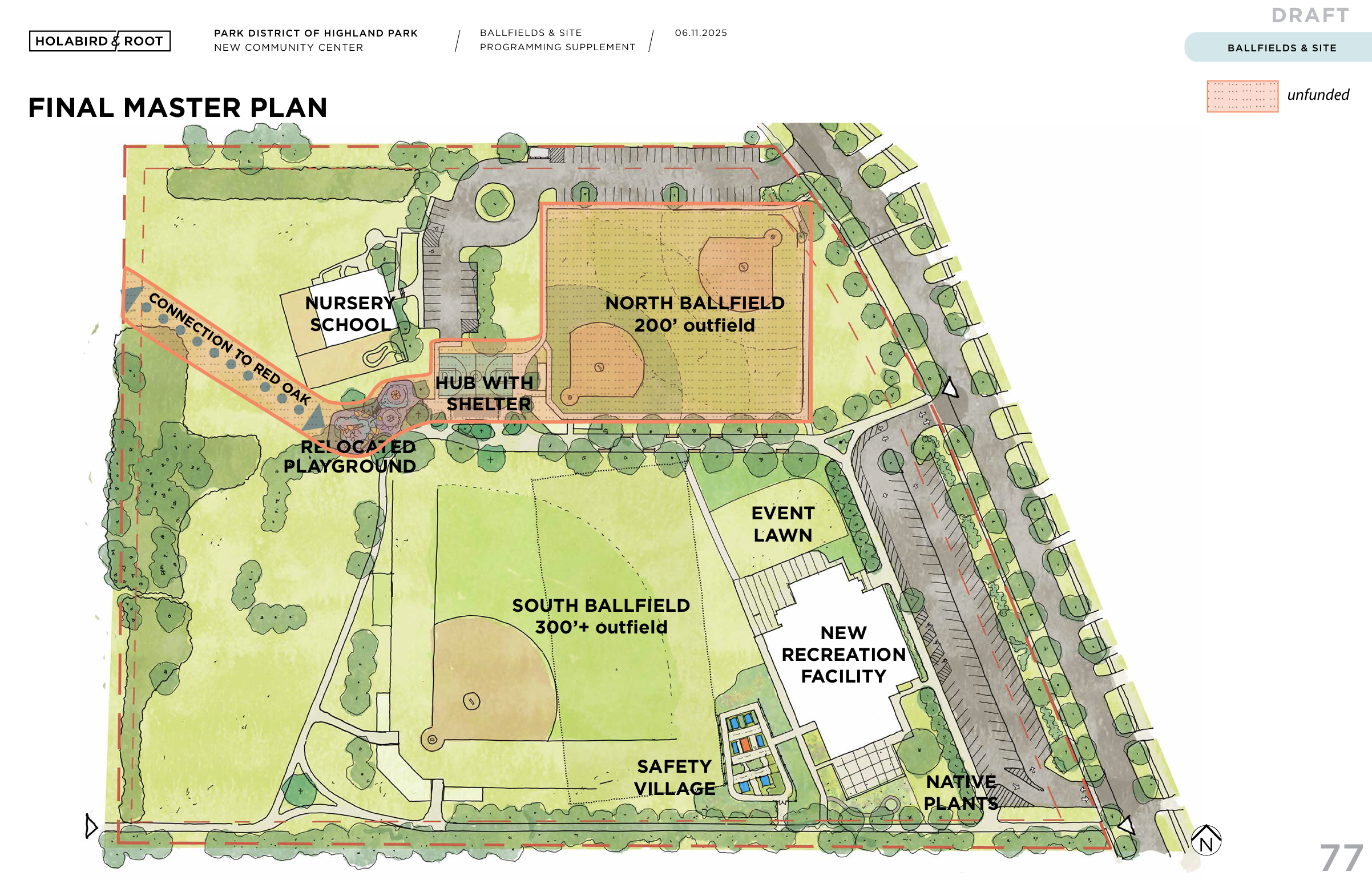 The Park District is concluding the design phase for the building and related site work and is on track to bid and award the construction contract by the end of the year. Design for the athletic fields and park elements will conclude design in 2025.