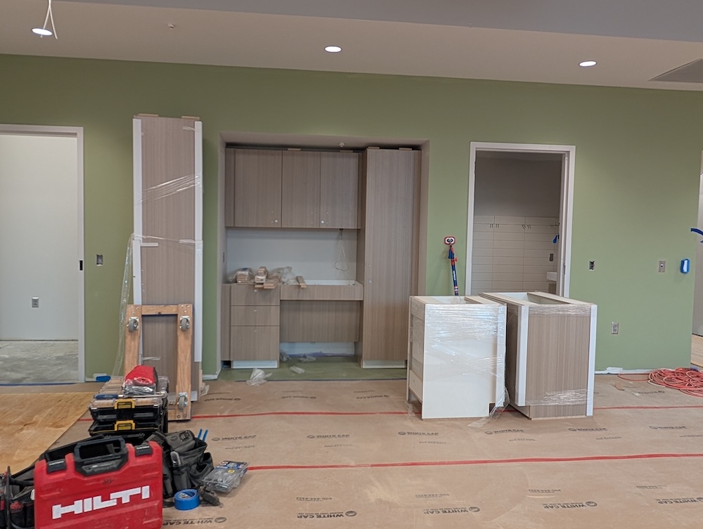Crews continue to make progress on interior finishes this week, including the installation of cabinetry, bathroom fixtures, lighting, and flooring.