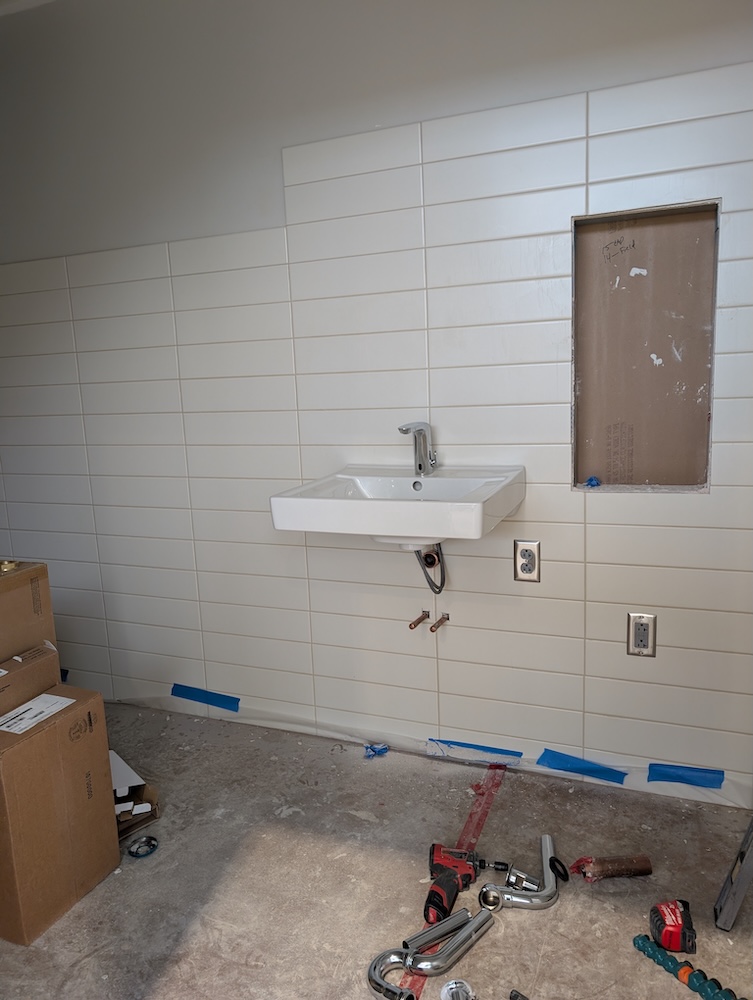 Tile installation is also underway in the restrooms, adding some of the the first finishing touches to the space.