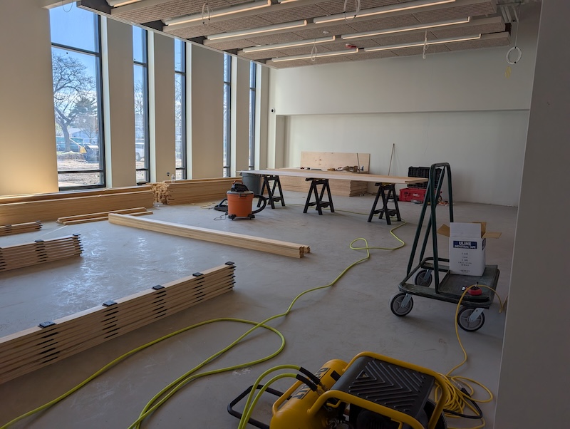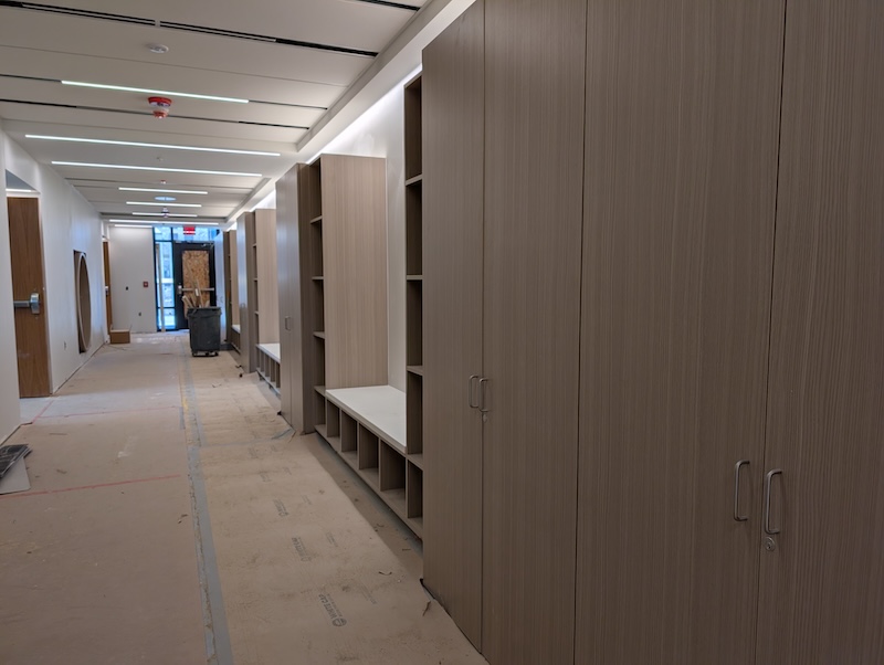 Crews are busy installing flooring, ceiling tiles, and cabinetry as interior spaces near completion.
