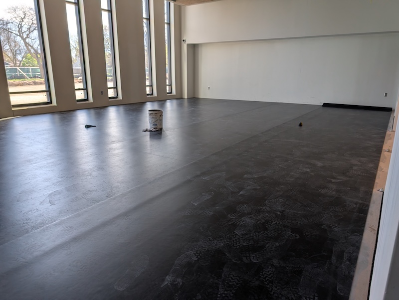 Crews are wrapping up remaining flooring, including tile in the lobby, while installation of the vinyl top layer of the dance floor is nearing completion.