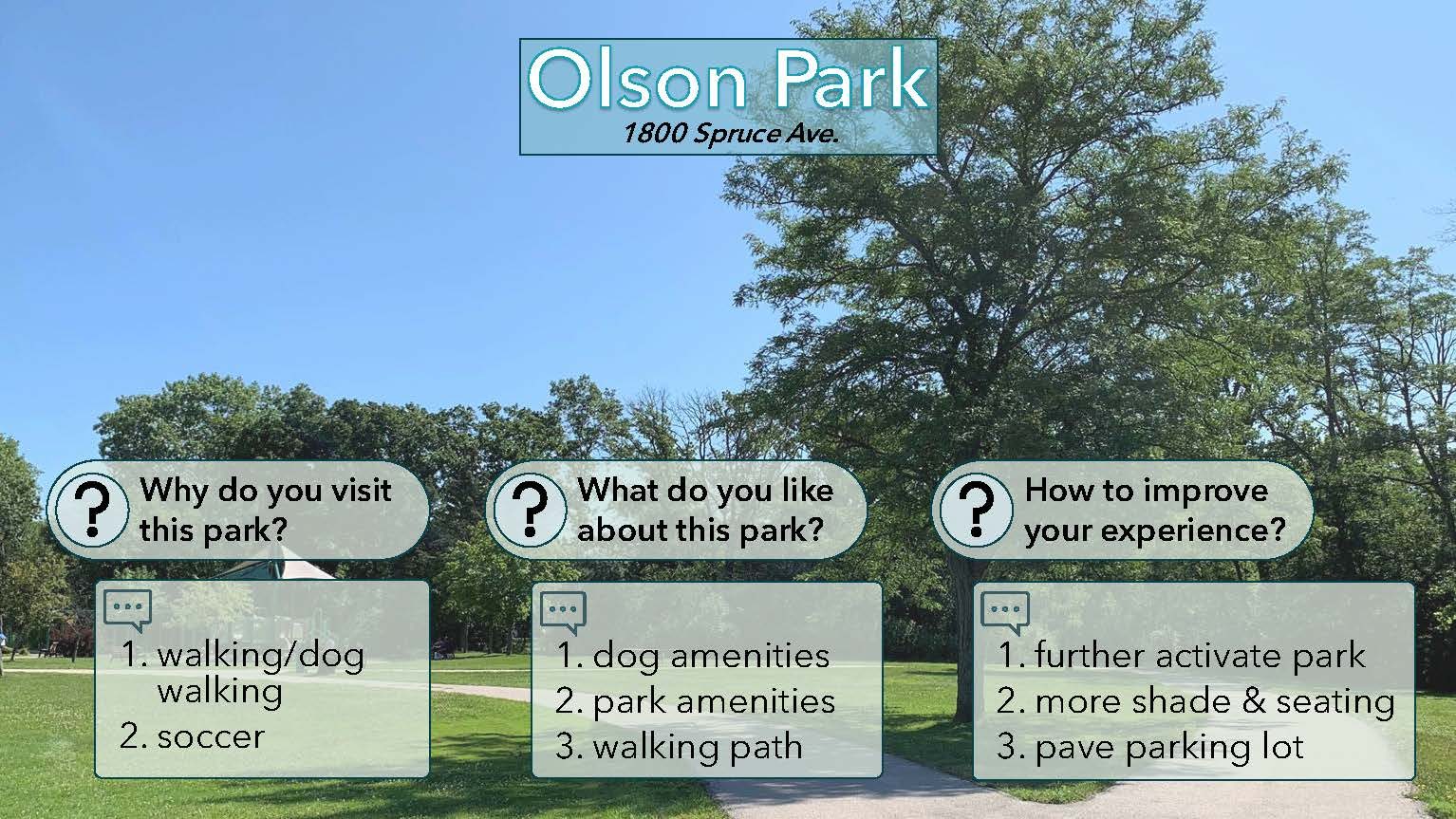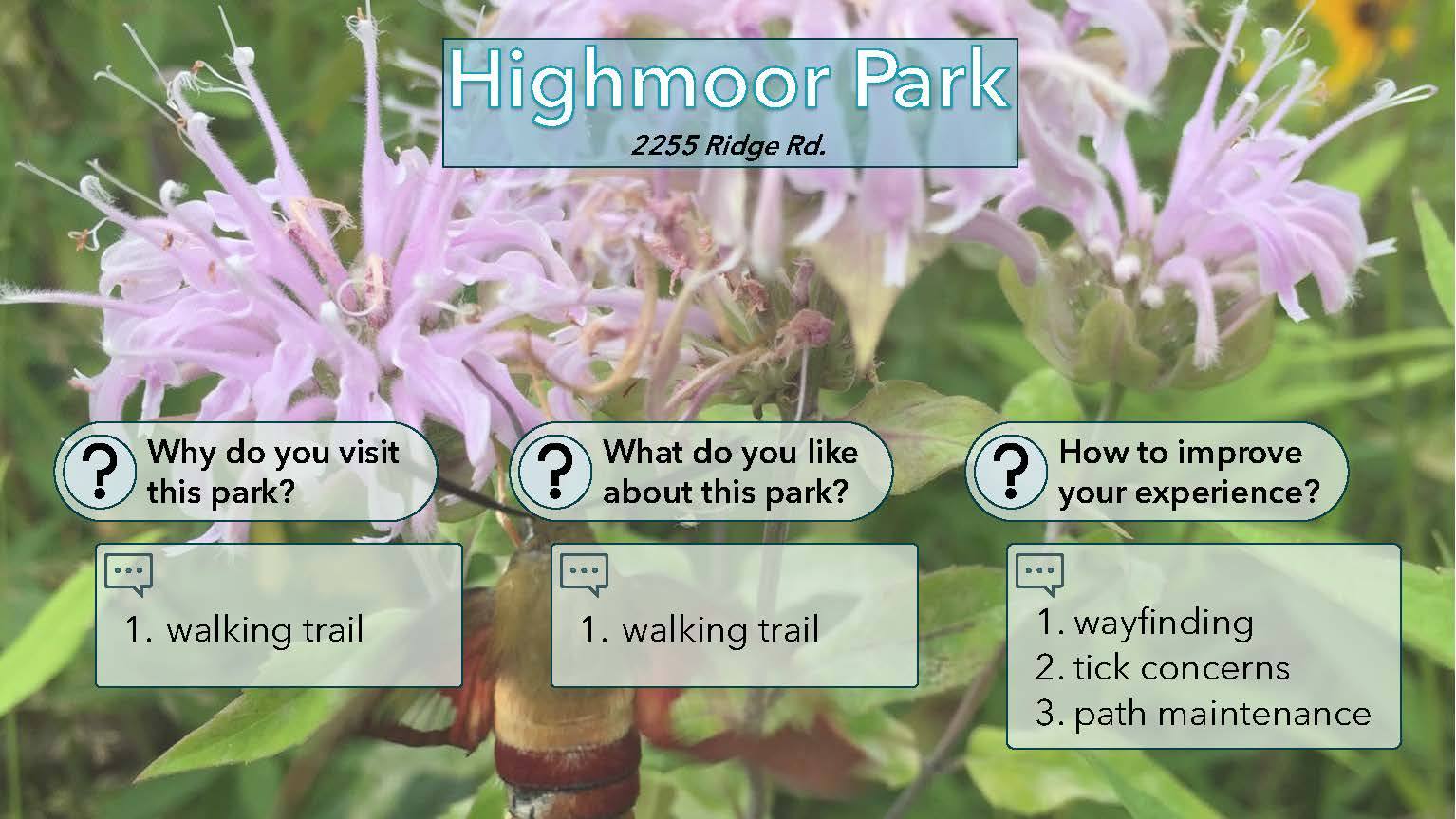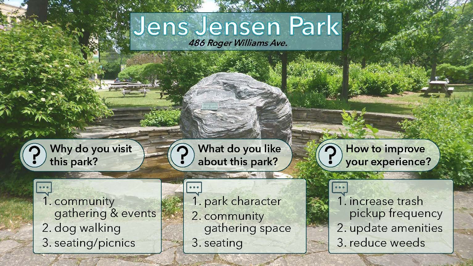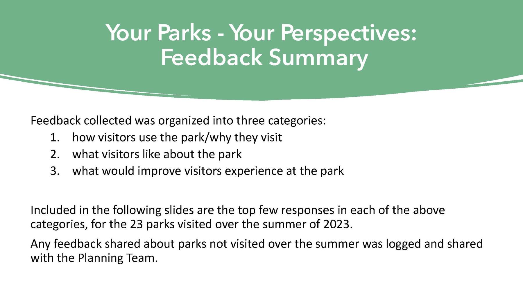 Feedback was collected to measure the Park District’s successes and opportunities to meet community needs through an online survey and conversations at the parks. The feedback will be used to guide the District’s operations and annual capital planning efforts.