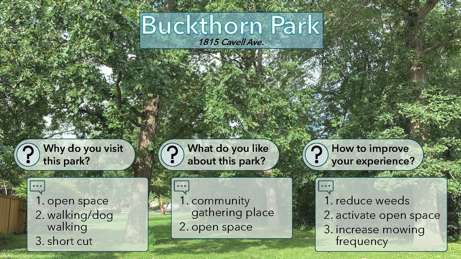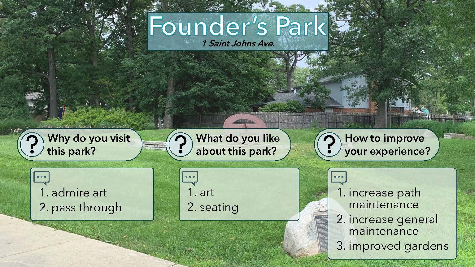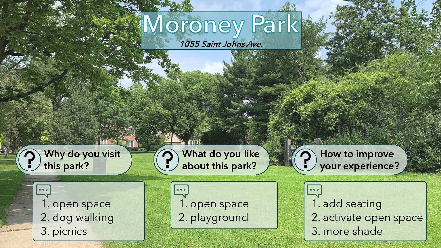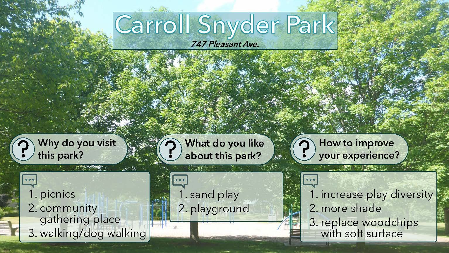 Feedback was collected to measure the Park District’s successes and opportunities to meet community needs through an online survey and conversations at the parks. The feedback will be used to guide the District’s operations and annual capital planning efforts.
