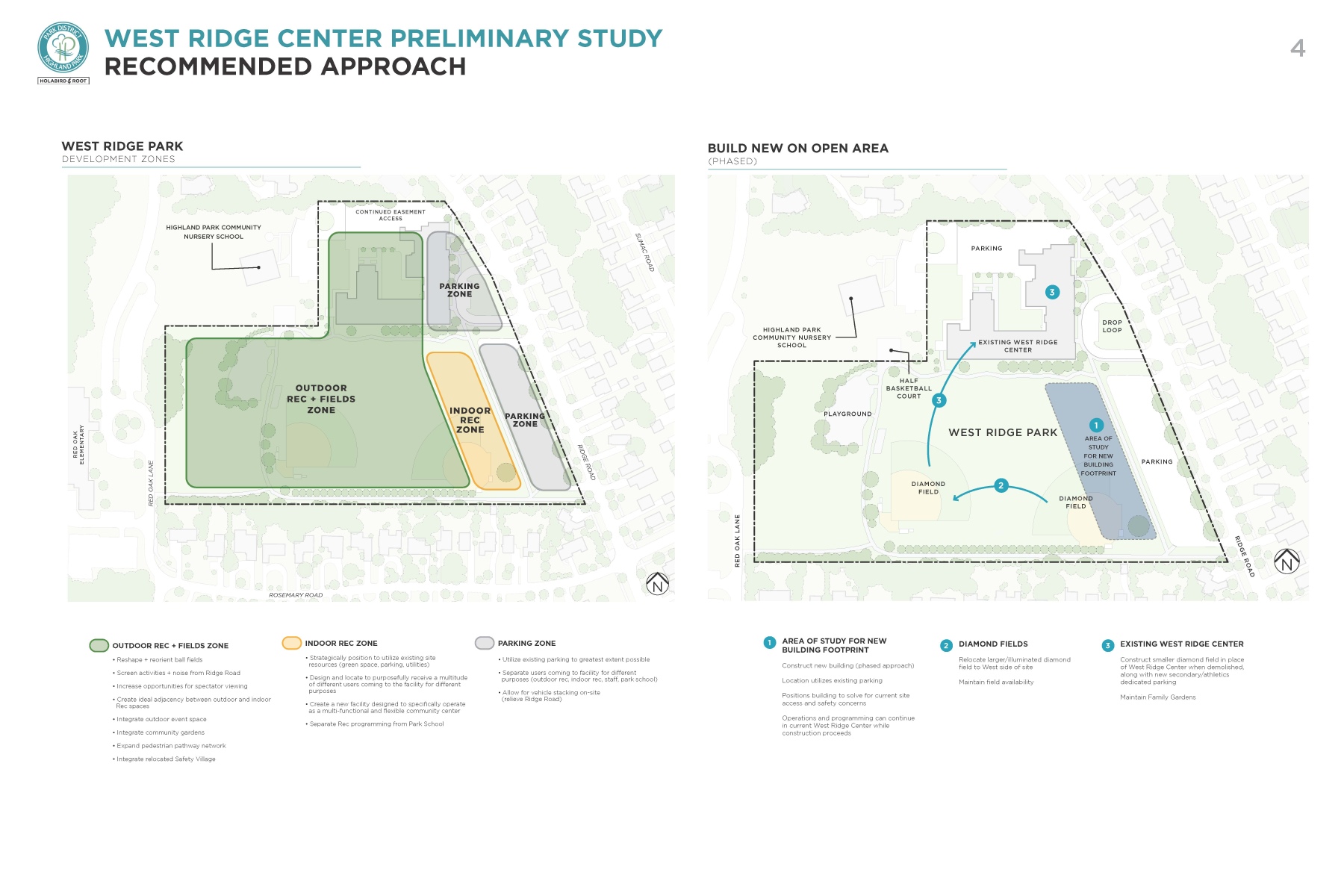 The recommendation based on the preliminary planning takes advantage of the existing parking and sets the building further south on the property. The map on the right highlights the development zones; the yellow box represents the general area proposed for the new building. The actual size and location of the new building will be determined through the planning process. The map on the right illustrates the proposed phased approach. The Park District would be able to continue operations at the West Ridge Center during construction. Once the new building was open, the existing building would be demolished. Improvements to the athletic fields would be addressed in future phases.